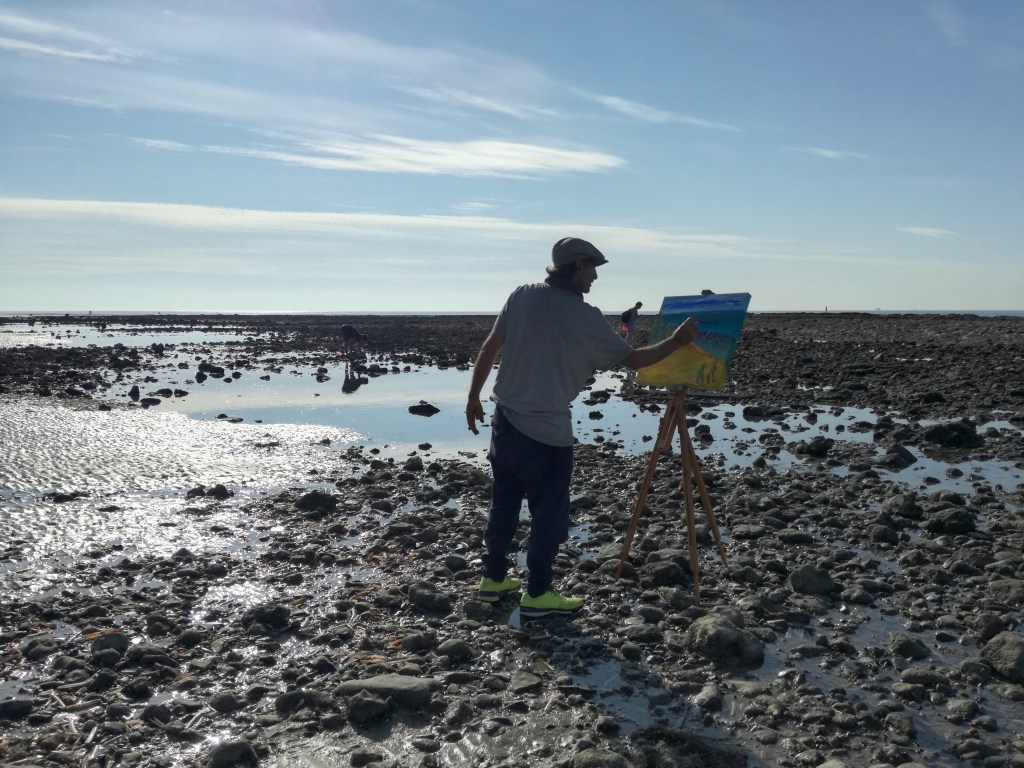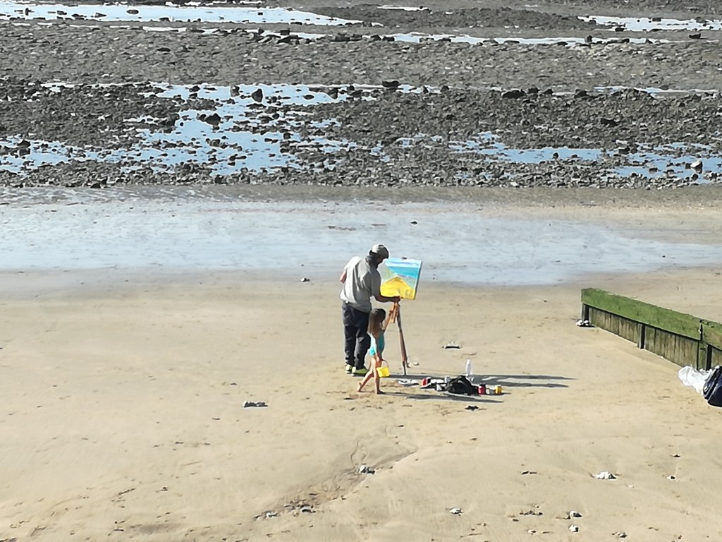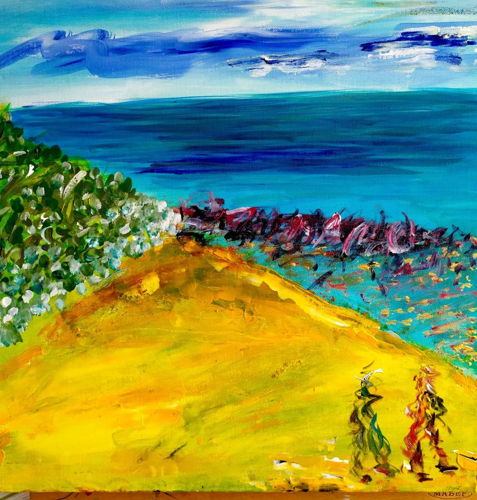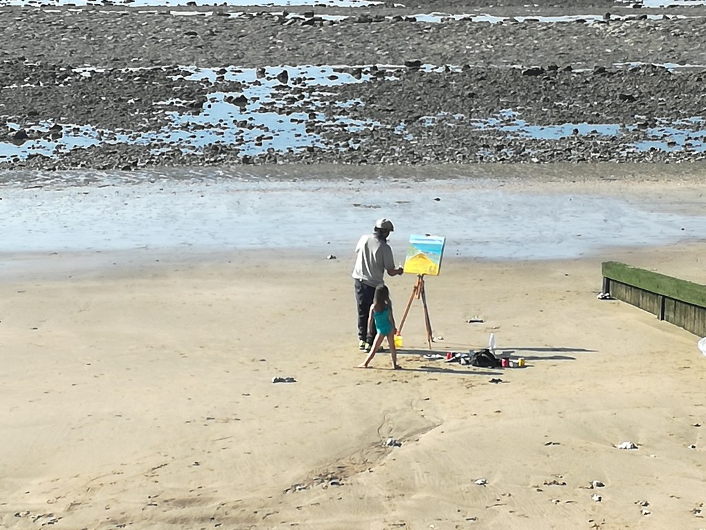 stavo dipingendo en plain air sulla spiaggia di Villerville, in Normandia, sull’oceano…quando si avvicina una bellissima bambina e in silenzio comincia tutta incuriosita ed interessata, a seguire il mio lavoro sulla tela. Sto dipingendo appunto la spiaggia e l’oceano, e allora piacevolmente sorpreso dalla nuova compagnia, dipingo nel quadro anche due persone: la bambina ed io. Quindi da spettatrice, con la sua bella, intelligente e silenziosa presenza, lei e’ entrata nel quadro…. sia per l’ispirazione che ha generato, quindi in modo invisibile, sia come protagonista dipinta.