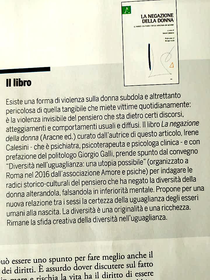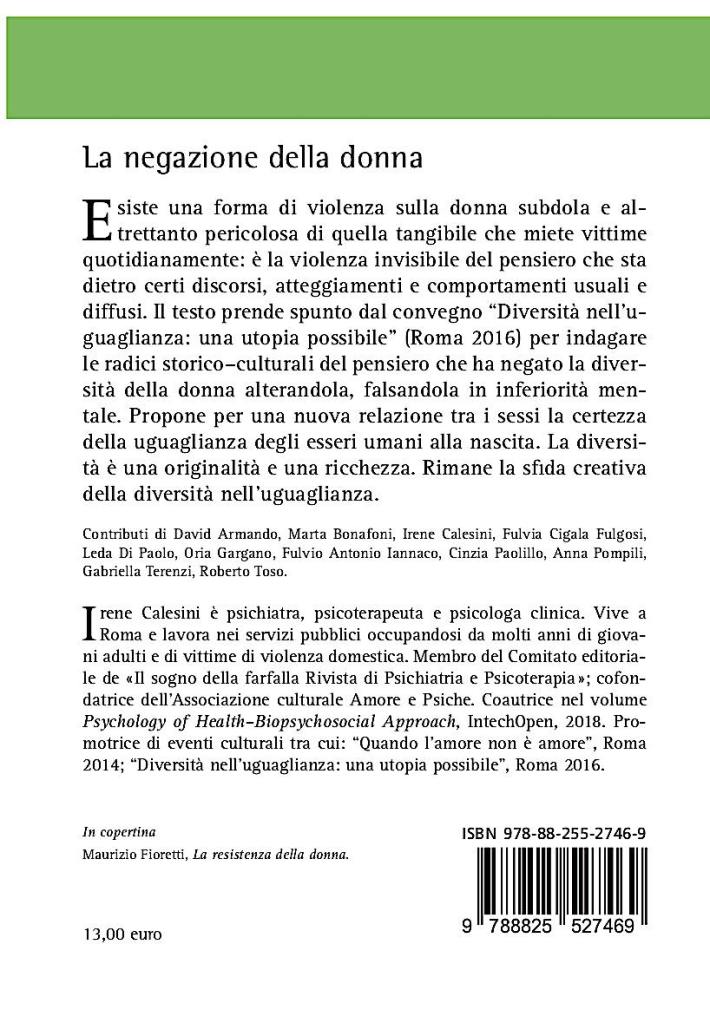 There is an underhand form of violence against women that is just as dangerous as the tangible violence that claims victims on a daily basis: it is the invisible violence of thought that lies behind certain discourses, attitudes and behaviour that are commonplace and widespread. The text takes its cue from the conference “Diversity in equality: a possible utopia” (Rome 2016) to investigate the historical and cultural roots of the thought that has denied the diversity of women, distorting it into mental inferiority. It proposes for a new relationship between the sexes the certainty of equality of human beings at birth. Diversity is an originality and a wealth. The creative challenge of diversity in equality remains. Preface by Giorgio Galli.