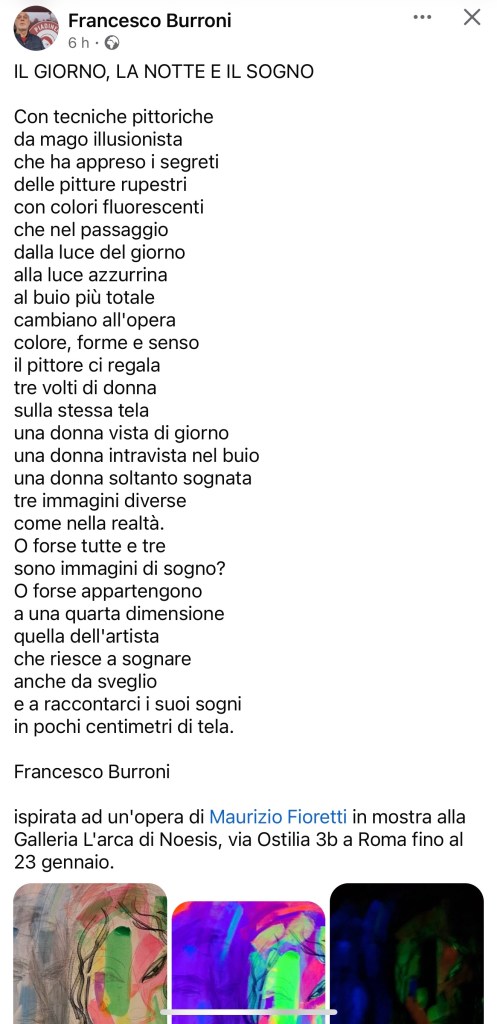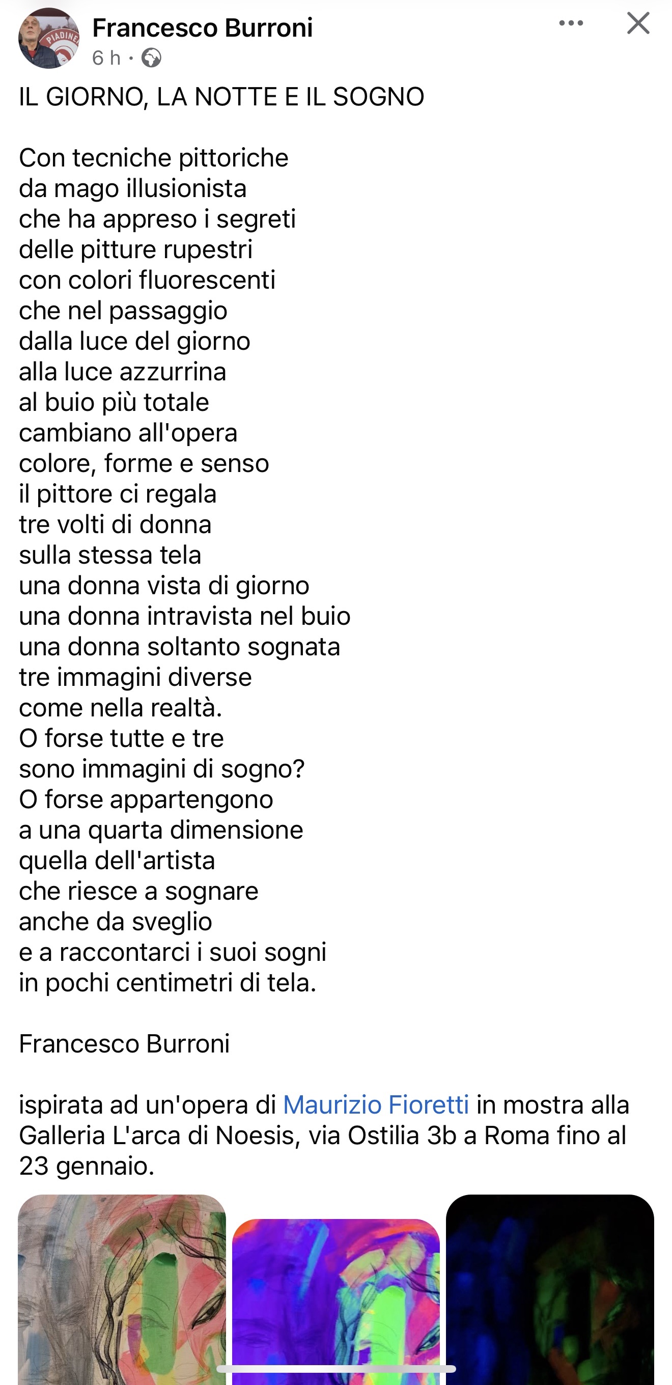 le immagini scaturite dal pennello di Maurizio Fioretti sono fondamentalmente forma e colore. Il contrasto tra immagine e sfondo crea nei rapporti tonali una dialettica, in cui emerge forte nell'essenzialita' delle forme l'esigenza da una parte del'autore di dare immediatezza visiva, che diventa immediatezza di comunicazione...''
